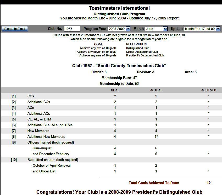 Distinguish Club Program Report – 2009 August 19, 2009February 27, 2020 by Tom Terrific, posted in Club History and Recognition Here’s how we did on the Distinguished Club Program for 2009. Share this: Click to share on X (Opens in new window) X Click to share on Facebook (Opens in new window) Facebook Click to share on LinkedIn (Opens in new window) LinkedIn Related