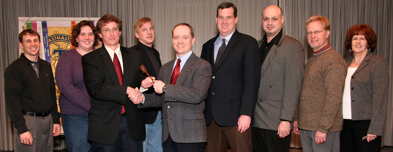 South County Toastmasters Past President Rich Ullrich passes gavel to newly installed President, Alan Kirby. (foreground left to right)  Other Officers also installed to serve through June 2010, as pictured (left to right):  Joe Archambault, Sergeant at Arms;  Erin Gissel, Vice President of Membership;  Kevin Wilson, Officer at Large;  Kevin Reichardt, Vice President Education;  Adam Kutell, Treasurer;  Steve Flick, Secretary;  Petrina Monti, Vice President Public Relations.