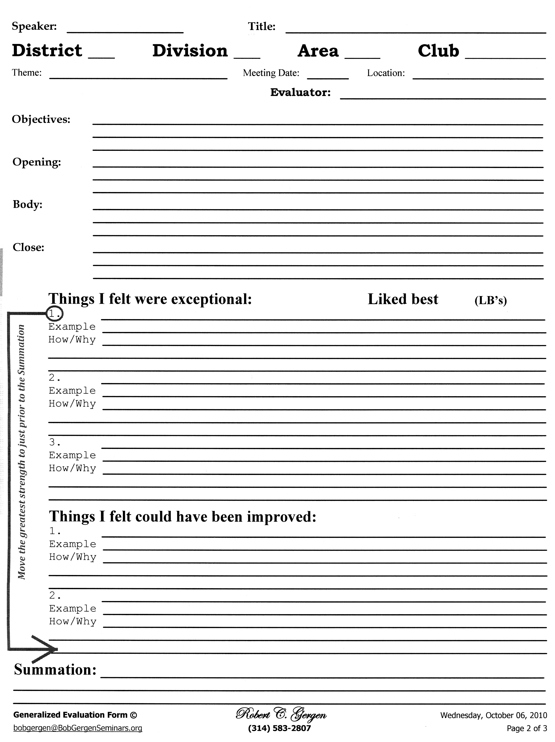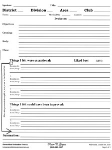 Evaluation Template October 17, 2010February 29, 2020 by Tom Terrific, posted in Speaking and Evaluating Bob Gergen was nice enough to share this with the club. Universal-Evaluation-Template Share this: Click to share on X (Opens in new window) X Click to share on Facebook (Opens in new window) Facebook Click to share on LinkedIn (Opens in new window) LinkedIn Related