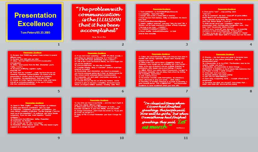 Tom Peters – Presentation Excellence August 24, 2011February 27, 2020 by Tom Terrific, posted in Speaking and Evaluating Tom Peters is an excellent business speaker and in this downloadable power point slide show, he give us 56 points to remember for “Presentation Excellence.” I would never use an all text slide show like this, but the points he makes are still valid. Click here to download the slides. Share this: Share on X (Opens in new window) X Share on Facebook (Opens in new window) Facebook Share on LinkedIn (Opens in new window) LinkedIn Related