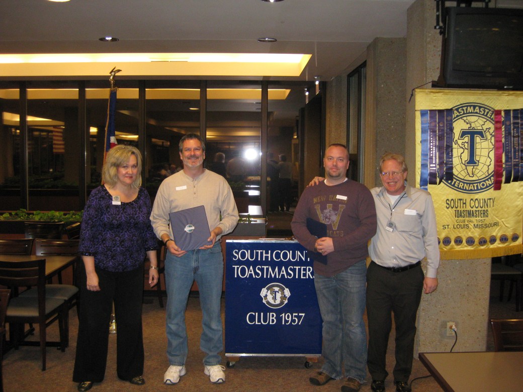 Welcome Thad James & Adam Calloway January 13, 2012September 25, 2019 by mdb12987, posted in New Members (From Left to Right) Joanne Korba – Mentor to Thad James Michael Marian – Mentor to Adam Calloway Both have joined to improve their speaking skills! Let’s welcome our newest members to SOUTH COUNTY TOASTMASTERS! Share this: Click to share on X (Opens in new window) X Click to share on Facebook (Opens in new window) Facebook Click to share on LinkedIn (Opens in new window) LinkedIn Related