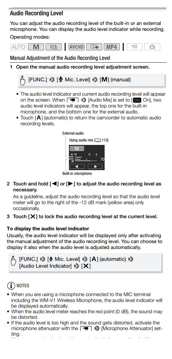 Put the camera in Manual mode to make the recording level changes below.