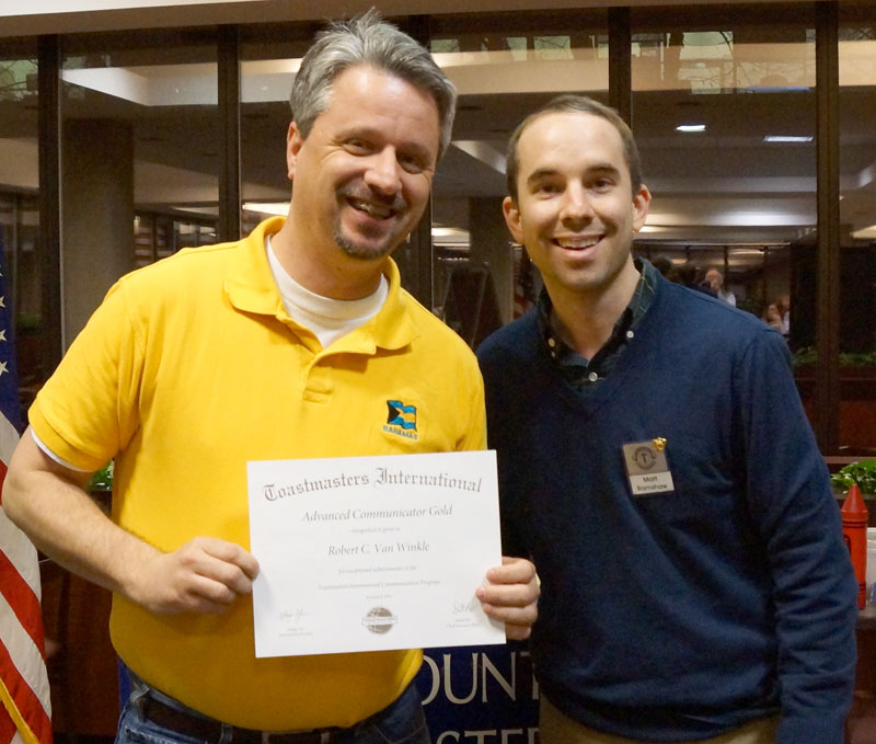 Rob Van Winkle earned the Advanced Communicator Gold Award. Presenting the award was President Matt Ramshaw.