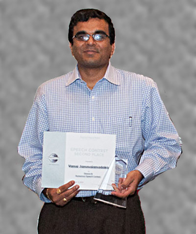Congratulations goes to Vamsi Jammalamadaka for his second place trophy at the District 8 Humorous Speech Contest.