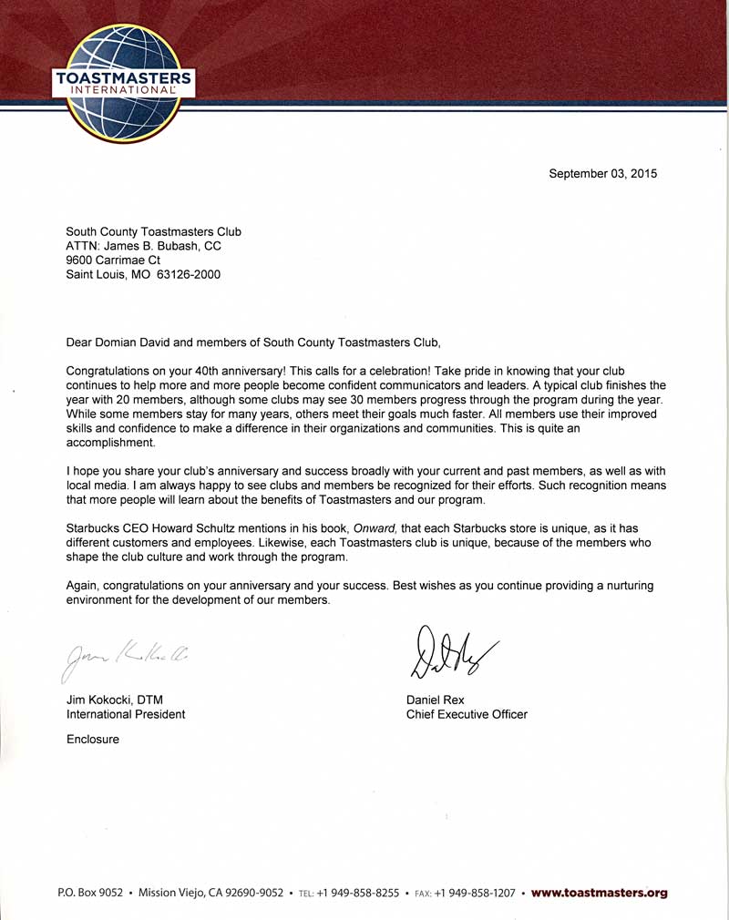 40th Anniversary Recognition October 1, 2015February 27, 2020 by Tom Terrific, posted in Member Achievements South County Toastmasters received this Certificate of Achievement from Toastmasters International. Congratulation to all club members and especially our one remaining founding member Howard Brandt. Share this: Share on X (Opens in new window) X Share on Facebook (Opens in new window) Facebook Share on LinkedIn (Opens in new window) LinkedIn Related