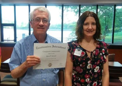 Congratulation to Brent Stewart for receiving his CC certificate at our meeting on May 9. Brent has been a member of SCTM since 1983 and this is the fifth time he has completed the Toastmasters’ basic communications manual.