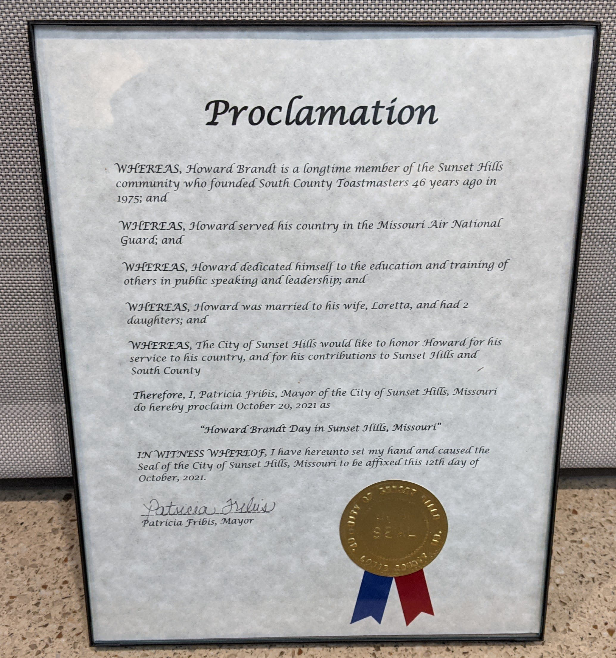 Howard Brandt Day October 21, 2021October 21, 2021 by Tom Terrific, posted in Club and Outside Social Events, Club History and Recognition Patrick Hunt, President, and Howard Brandt Howard Brandt was honored at the latest club meeting with a Proclamation from the mayor of Sunset Hills, Patricia Fribis, stating that October 20, 2021 was “Howard Brandt Day in Sunset Hills, Missouri.” Share this: Click to share on X (Opens in new window) X Click to share on Facebook (Opens in new window) Facebook Click to share on LinkedIn (Opens in new window) LinkedIn Related