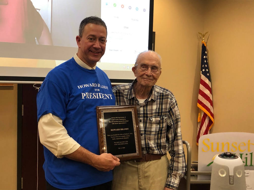 In October of 2020, South County Toastmasters celebrated it’s 45th anniversary. Howard gave a speech about starting the club at the October 21st, 2020 celebratory meeting. He was awarded a plaque of appreciation from the membership.